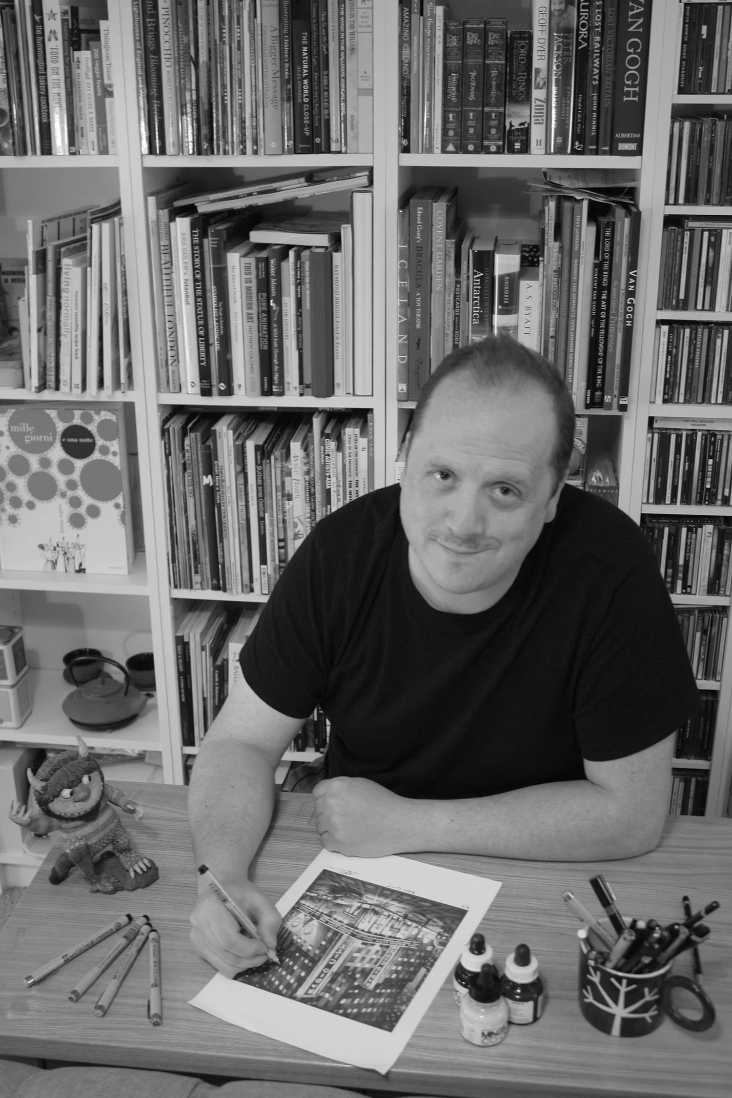 My illustrations are produced using a cross-hatch technique with a black fine line pen. Layer upon layer of small ink lines are built up to create light and shade. It’s a very time consuming process.